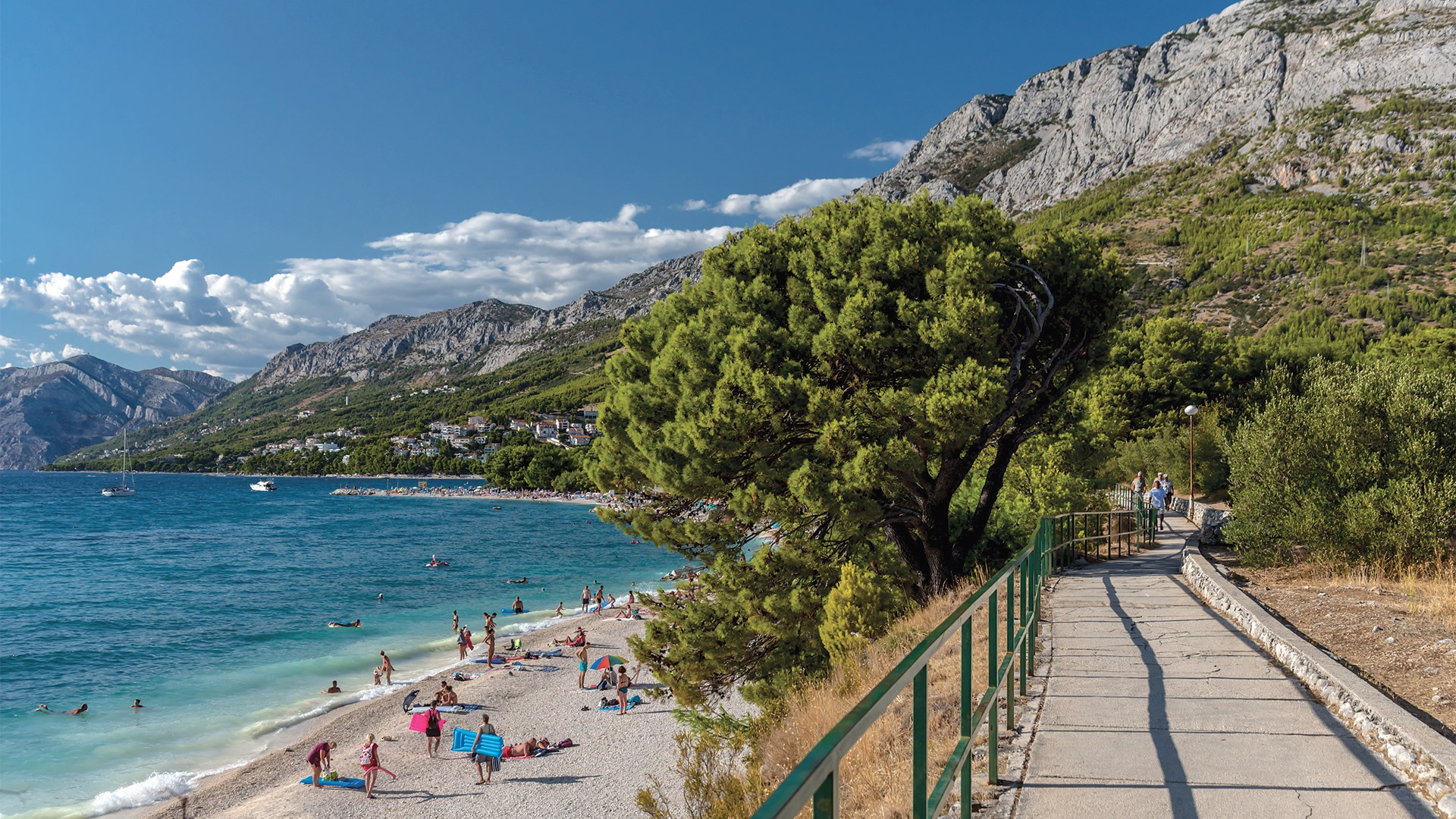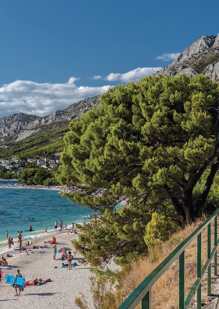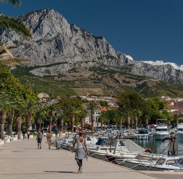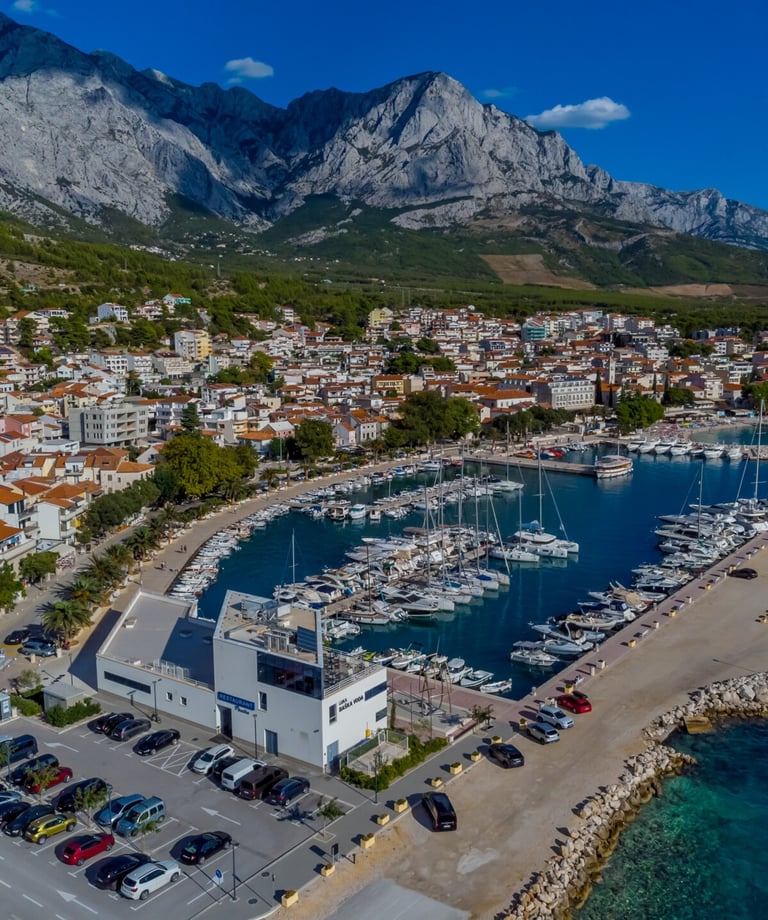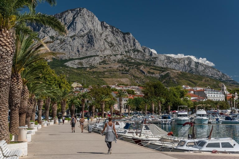 A scenic seaside promenade stretches along the coast, connecting Baška Voda, Brela, and Baško Polje.